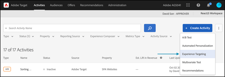 在Adobe Target中,導覽至 Activities 頁面,然後選取 Create Activity > Experience Targeting。