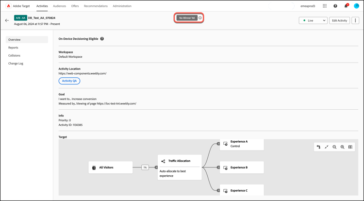 使用Auto-Allocate功能時,Target會在活動的頁面上方顯示徽章,指出「尚未有贏家」,直到活動達到具有足夠信賴的最低轉換數量為止。