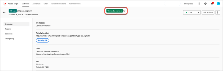 宣告明確的獲勝者時,Target會顯示「獲勝者:體驗X」徽章。