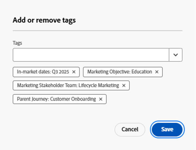 Journey Optimizer 中的標記和標記類別可讓您完成與命名慣例相關的許多指定目標,而且沒有上述範例中所述的複雜性。團隊可以篩選這些標記和類別,而歷程名稱可以更清楚地聚焦於所驅動的客戶里程碑。