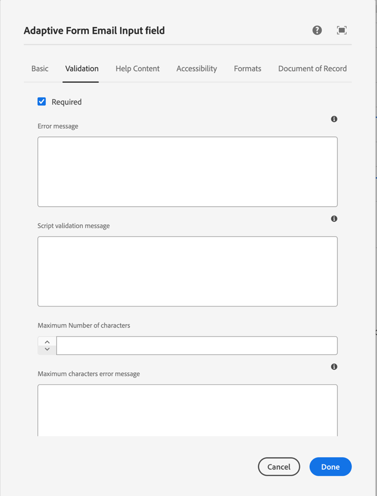 AEM Forms 也可讓您新增自訂錯誤訊息。驗證規則與錯誤訊息功能不需要開發,內容作者也可以輕鬆更新。