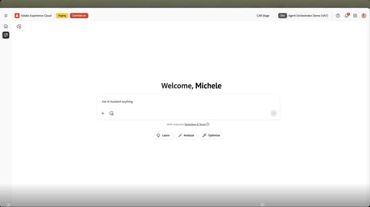 歡迎來到Adobe Experience Platform的未來。 我們很高興在集中式使用者介面中展示使用Data Insights Agent的功能,此介面旨在將Adobe的智慧型代理程式功能整合在一起,提供順暢的體驗。