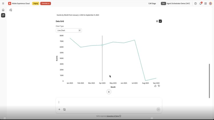 在幕後,Data Insights Agent會剖析要求,確認需要每月劃分、將事件識別為關鍵量度,並將時間範圍設定為本年度。 其結果是動態的趨勢線條視覺效果,將您的資料生動呈現,直接顯示在沈浸式應用程式中。